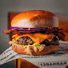 Pão australiano, burger 100% angus de 150g, queijo cheddar, cebola caramelizada, bacon & maionese do 13.