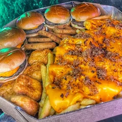 5 unidades dos minis hambúrgueres mais queridinhos do litoral, composto por pão, blend angus, molho cheddar e maionese do 13, 5 unidades de cebola empanada Mccain Pickers, batata Surecrisp com cheddar e farofa de bacon & 5 unidades de nuggets sequinhos e crocante.