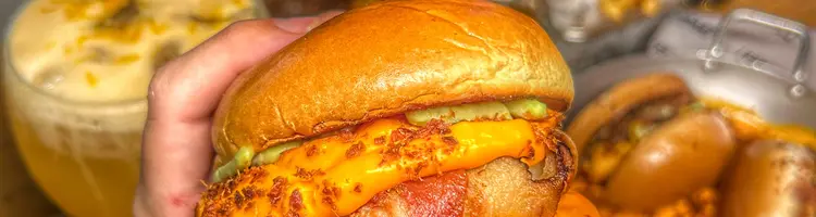 Pão brioche, burger 100% angus de 90g, mix de queijo empanado, bacon & maionese do 13.